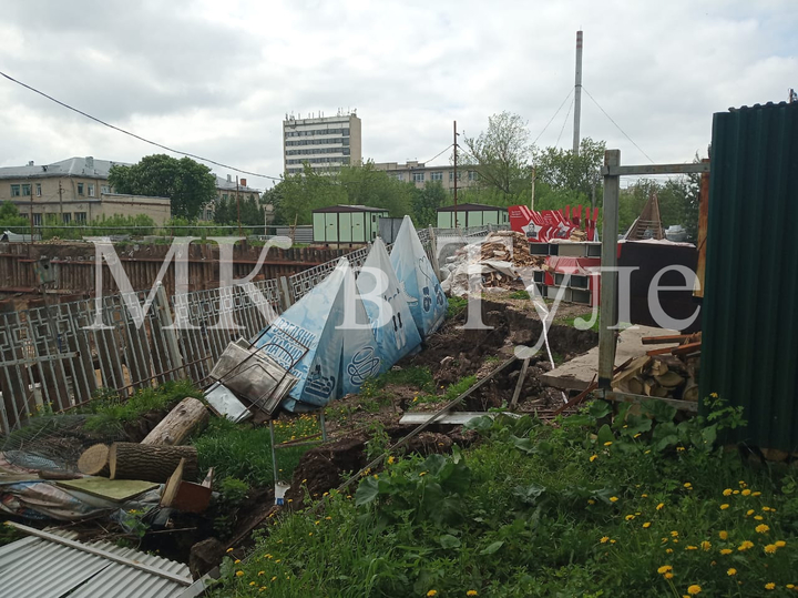 11 мая жители близлежащих домов впервые заметили, что после череды проливных дождей на стройке обвалился грунт, наклонились опорные столбы, местами упал забор.