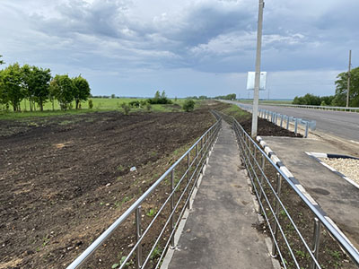 На фото видно, что перила с тротуаром спускаются с придорожного склона, протягиваются несколько метров вдоль дороги и завершаются в земле.