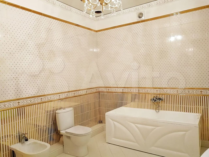 Отделка выполнена из премиум-материалов. В ванной комнате использована плитка с позолотой, итальянская и французская сантехника. Смесители также с позолотой и кристаллами Swarovski.