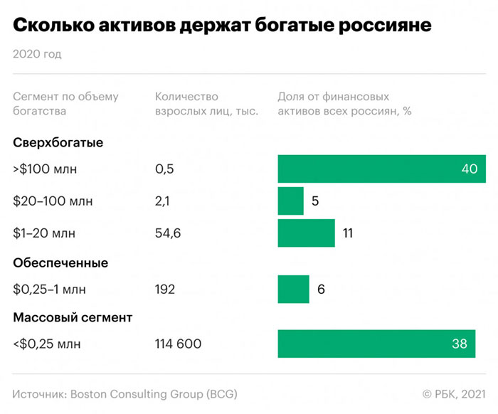 Очередное исследование зафиксировало очень высокую концентрацию богатства в России в руках ее самых состоятельных резидентов. Международная консалтинговая компания Boston Consulting Group (BCG) представила ежегодный доклад о мировом благосостоянии (есть у РБК), частью которого традиционно стали данные по России. Они, в частности, показали, что менее 0,0001% взрослого населения в России — около 500 «сверхбогатых» граждан — владеют 40% всех финансовых активов россиян, или суммой $640 млрд.
