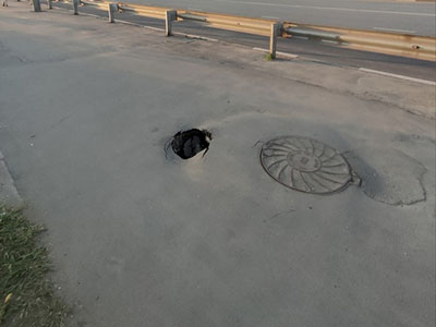 Дорожники дефект залатали, но не прошло и месяца, как участок дороги снова просел. Предположительно, провалы могли стать следствием размыва грунта канализационным коллектором, так как дыра образовалась в районе коммуникаций.