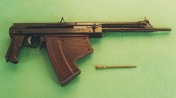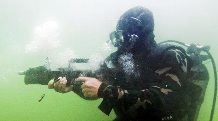 По его словам, для ведения огня после выхода из воды бойцу достаточно установить магазин с унитарными малоимпульсными патронами 5,45 х 39 мм. Прицельная дальность стрельбы из этого автомата на земле может достигать 500 м.