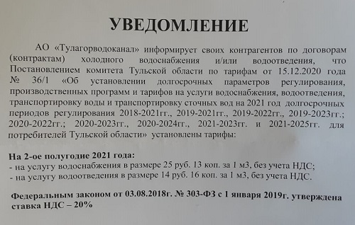 АО «Тулагорводоканал» информирует туляков и гостей нашего города о плановом повышении тарифов на водоснабжение и водоотведение.