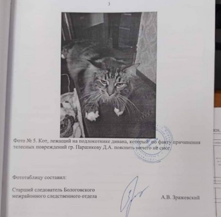 «Фото №5. Кот, лежащий на подлокотнике дивана, который по факту причинения телесных повреждений пояснить ничего не смог», — гласит подпись под котофеевым портретом.