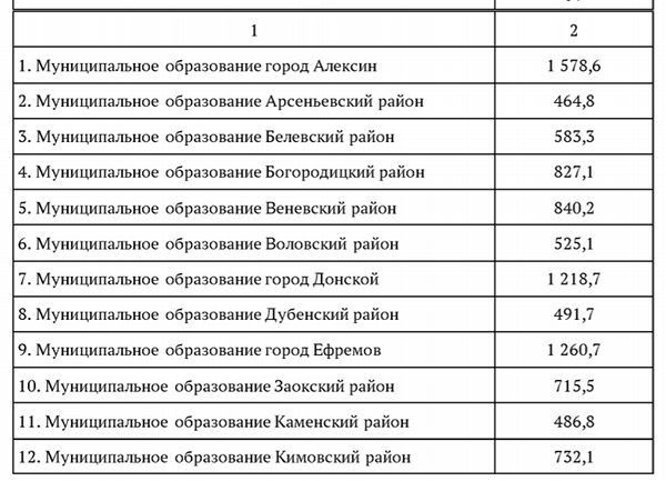 Согласно Постановлению, всего на эти цели выделено 36 313,2 тысяч рублей. Больше всего дотаций получит Город Тула — 14 479,9 тысяч рублей. Меньше всего достанется поселку Новогуровский — 132,4 тысячи рублей и поселку Славный — 156,2 тысячи рублей.