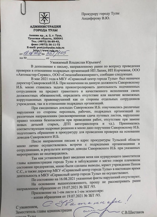— После направления письма в адрес прокуратуры Тульской области мною лично осуществлялись встречи с подрядными организациями и сотрудниками, в результате которых доводы Саворовского И.Б. при указанных мероприятиях не подтвердились, — говорится в обращении в прокуратуру уже в августе.
