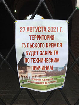 В редакцию Myslo обратились туляки, которые не смогли [27 августа] попасть на территорию кремля. На входе в кремль висит табличка, что он закрыт для посещения по техническим причинам.