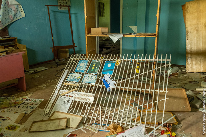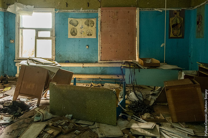 Потолочные плафоны явно приготовили для того, чтобы унести, а от учебные пособия почти все поломали или забрали в качестве сувениров.