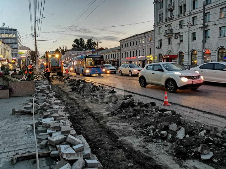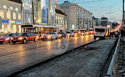 Причиной затора стал ремонт дороги на проспекте — в районе ул. Каминского рабочие почти полностью «отрезали» полосу движения в сторону ул. Советской, сняв асфальт и бордюрный камень.
