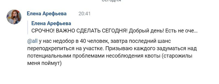 Вот, например, замдиректора Института прикладной математики и компьютерных наук Тульского госуниверситета Елена Арефьева в открытую пишет во внутренних группах о квотах и грозит задуматься о потенциальных проблемах, если их не выполнят.