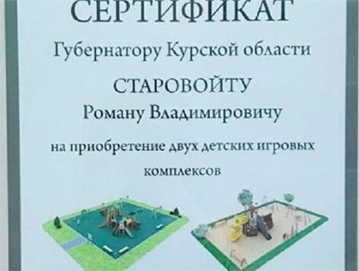 Сертификат на покупку игровых комплексов получил губернатор Курской области Роман Старовойт, который передал его главе города Курска Виктору Карамышеву.
