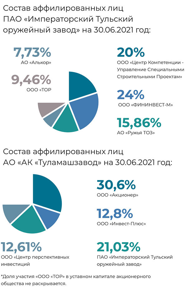 В конце июня АО «АК «Туламашзавод» также опубликовало список аффилированных лиц, и сюрпризов в нем не оказалось. Существенный процент акций «Туламашзавода» — в руках его «дочек» и фирм, подконтрольных «ТОРу».
