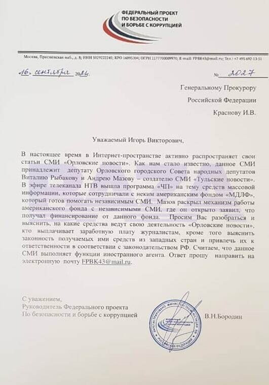 Глава «Федерального проекта по борьбе с коррупцией» (ФПБК) Виталий Бородин попросил Генпрокуратуру признать «Орловские новости» «иноагентом» из-за иностранного финансирования в размере 50 долларов. Об этом сообщают ТАСС и Baza.