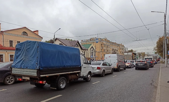 На 8:40 утра пробка в три остановки собралась на улице Октябрьской. Также от самих заводов стоит и Советская.