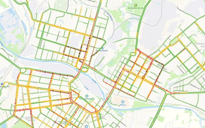 Cейчас по данным Яндекс.Карты затруднение движения наблюдается по всем ключевым улицам города. Выбирайте пути объезда.