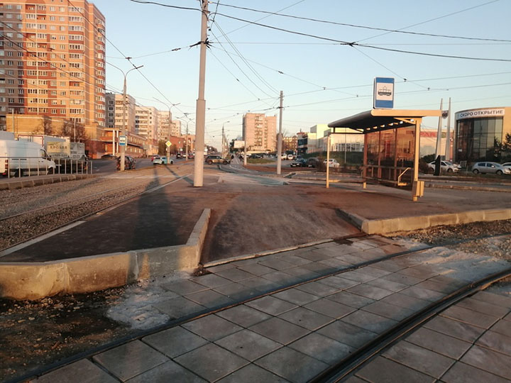 Складывается недобрая традиция делать велодорожку между остановкой общественного транспорта и самим транспортом. Так сделали на Восточном обводе, так сделали и около Депо.