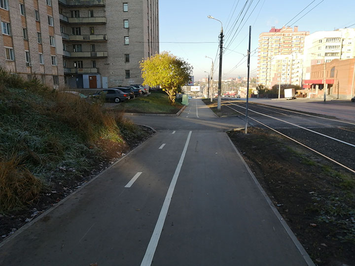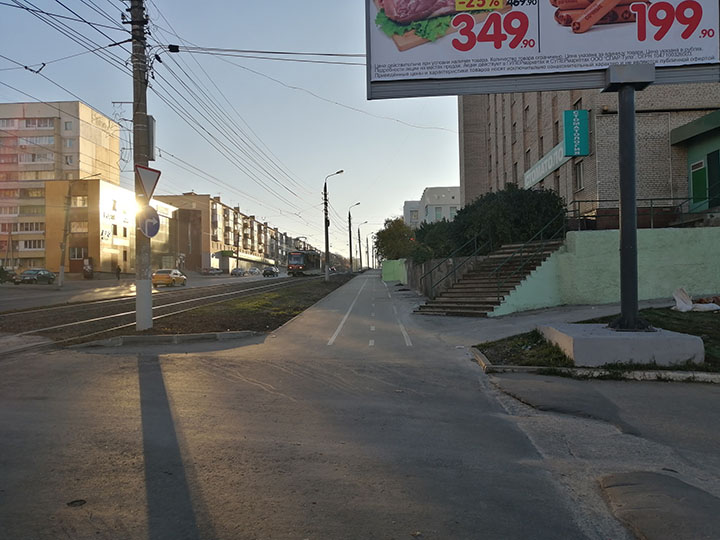Далее велодорожка внезапно перебирается на другую сторону тротуара. И всё бы ничего, но в районе ГиперСПАРа довольно высокий перепад по высоте между тротуаром и парковкой. Так что не крутите рулем, чтобы не съехать под откос. Подъезжаем к общежитию. Это здание прославил на всю страну режиссер фильма «Дурак» Юрий Быков и наша велодорожка проходит вплотную к ступенькам и к подпорной стенке, оштукатуренной шершавой шубой. Хотите ободрать правую руку — велком. Дальше мы встречаем множество мест, где велодорожка идет вплотную к выходам из магазинчиков и торговым ларькам. Хотя гораздо приятнее и безопаснее ехать ближе к трамвайным путям.