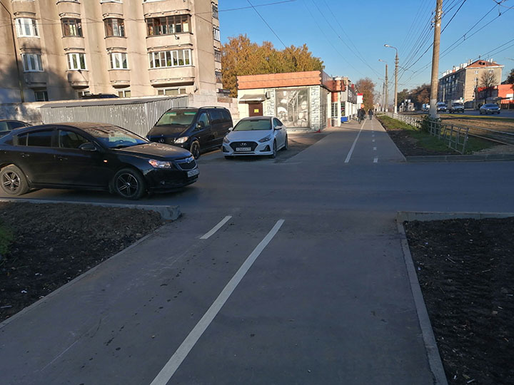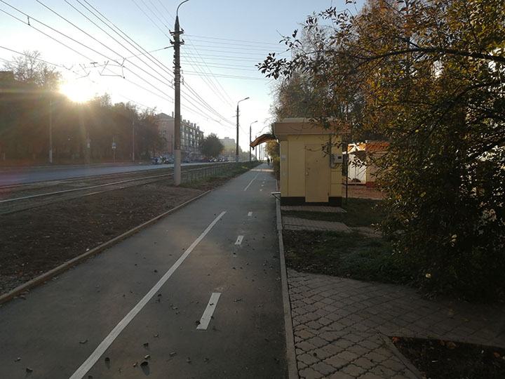 Между остановкой Декабристов и Быткомбинат есть загадочное место, где автолюбители считают возможным двигаться по тротуару с целью припарковаться на газоне. И здесь велодорожка проходит вплотную к припаркованным ТС. Будут ли установлены полусферы, чтобы помочь автолюбителям не нарушать ПДД и препятствовать выезду на велопешеходную дорожку или ограждения между газоном и тротуаром, не понятно, но мы надеемся на лучшее. В районе быткомбината похожая ситуация, но тут водители просто паркуются на тротуаре. Вообще на Металлургов много мест, где паркуются на газоне.