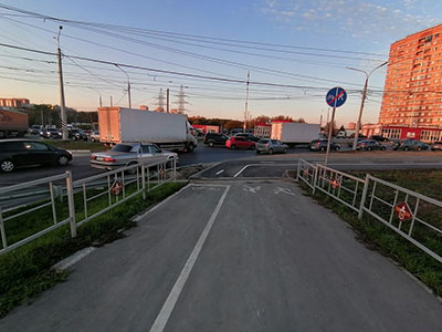 На улице Металлургов мы имеем велопешеходную дорожку с зоной для движения велосипедистов, которая по большей части расположена не с той стороны. Нет никаких дорожных знаков, предупреждающих водителей, выезжающих из многочисленных дворовых проездов, что теперь здесь двигаются не только пешеходы, но и велосипедисты. Есть разметка, но нет пиктограмм с изображением велосипеда и пешехода. А они нужны, чтобы люди не держали в голове, где им можно идти, а нет. Нет средств препятствующих выезду автомобилей на велопешеходную дорожку. К сожалению, там, где было возможно, максимально расширять тротуар не стали. А ведь можно было сделать пешеходную часть более комфортной ширины. Дорожники ограничились минимальным значением ширины для велопешеходной дорожки в 3,25м (ГОСТ 33150 таблица 4). Торговые ларьки с козырьками, стоящие впритык к тротуару — место потенциальных конфликтов между велосипедистами и покупателями. Велодорожка не должна идти рядом с ларьками или ларьки не должны стоять на велодорожке.