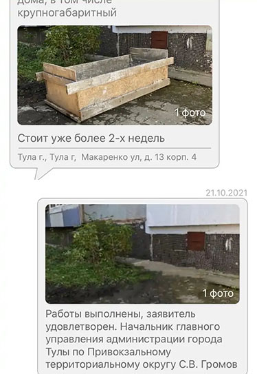 Туларегеон-71 отправляет требование контроля на обращения граждан и их исполнения в Главные управления по территориальности, в данном случае в Привокзальный, ну а чиновники как всегда, вместо того что бы осуществить выход на место проблемы, сидя на пятой точке как телефонный оператор не выходя из кабинета позвонил нарушителю, ему отчитались и предоставили фото, он отчитался…
