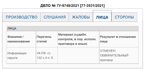 19 октября сего года в кассации был отменён  обвинительный приговор Киреевского районного суда Тульской области по делу 71RS0013-01-2020-001501-83. Информация по делу из-за весьма специфичной квалификации преступления полностью обезличена.