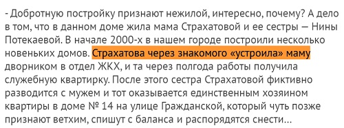 « Страхатова через знакомого «устроила» маму дворником в отдел ЖКХ, и та через полгода работы получила служебную квартирку.»