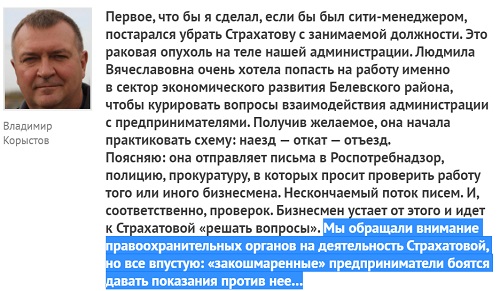 (« Мы обращали внимание правоохранительных органов на деятельность Страхатовой, но все в пустую: «закошмаренные» предприниматели боятся давать показания против нее…»;