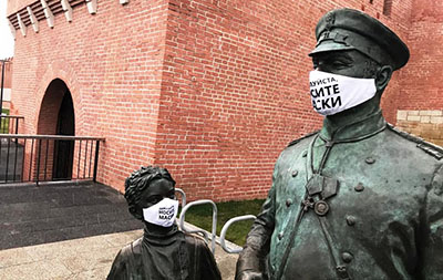 Средства индивидуальной защиты оказались на лицах городового, установленного у стен Тульского кремля, мужичка-тулячка, расположенного на улице Металлистов и металлурга в Пролетарском округе города.