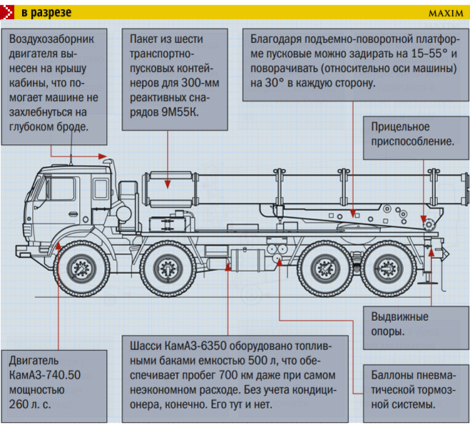 Зато четырехосное шасси КамАЗ-6350 намного легче — машина теперь может разъезжать по дорогам общего пользования, а шоссейные мосты грузоподъемностью до 25 тонн под ее тяжестью не рухнут. Так что, если кто живет за речкой, пусть не радуется. Впрочем, что там речка! Дальность полета ракет — 90 километров. Трепещите все в этом радиусе!