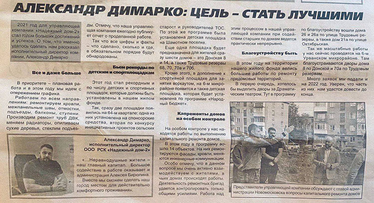Кроме того, газета Бычкова, «Новомосковск сегодня», регулярно публикует материалы об упомянутой управляющей компании и ее директоре.