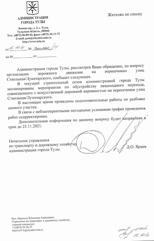 27.11.2020 г. после произошедшего ДТП с участием троллейбуса жители МКД подали коллективное обращение на имя Главы Администрации города Тулы Миляева Д.В. В итоге нам был обещан долгожданный пешеходный переход к началу учебного года – к 01.09.2021г. (письмо Администрации ПКол-6662/4 от 25.05.2021г.).