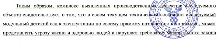 Комплекс выявленных производственных дефектов свидетельствует о том, что в своем текущем техническом состоянии исследуемый модульный детский сад к эксплуатации по своему прямому назначению не пригоден, может представлять угрозу жизни и здоровью людей.