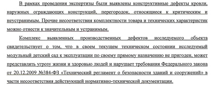 Вот, к примеру, выдержки из заключения эксперта ТПП по модульному детсаду, возведенному в поселке Петровском на ул. Паустовского.