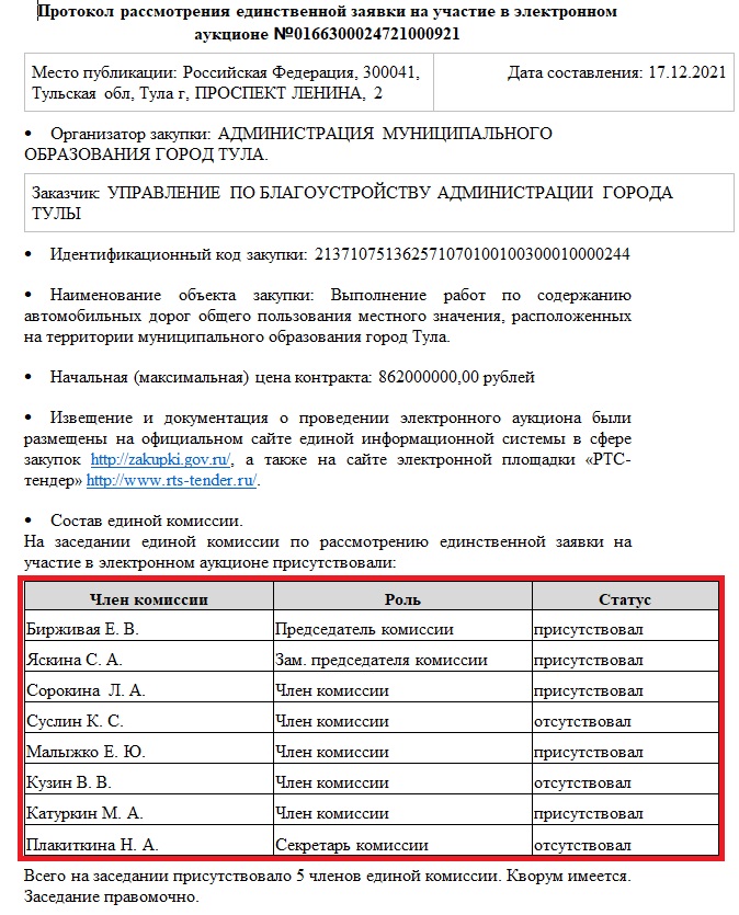 Как мне кажется, сотрудники управления по организации закупок и контролю за ценообразованием администрации г. Тулы в очередной раз по-матерински позаботились, чтобы у АО «Спецавтохозяйство» не было конкурентов при проведении конкурса на муниципальный заказ стоимостью 862 000 000 рублей.