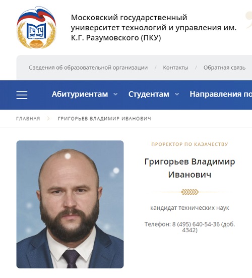А это скрин с сайта Московского государственного университета технологий и управления имени К.Г. Разумовского (Первый казачий университет), где его полный тезка трудится проректором по… казачеству!