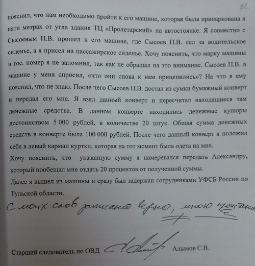 Ведь как мы писали ранее ни в рапорте сотрудника ФСБ, ни в заявлениях Сысова П.В. и Акининой Ю.К., ни в материалах ОРМ «прослушивание телефонных переговоров» такой информации нет, что через 9 месяцев признает подполковник юстиции Юрищев П.А.