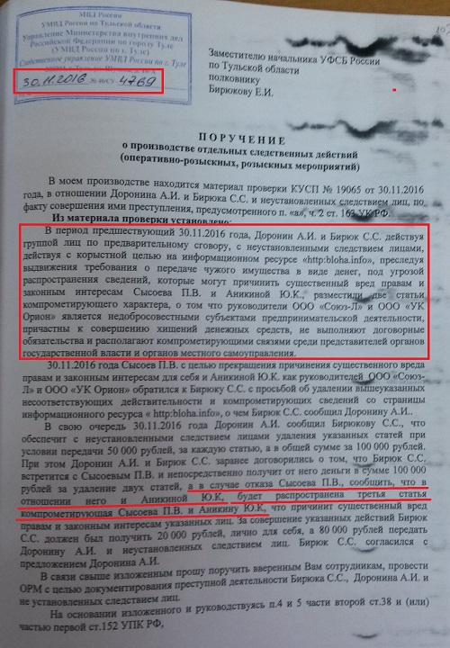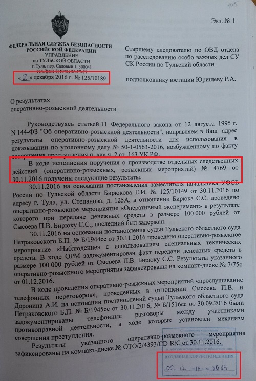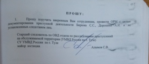 Наиболее внимательные наши читатели наверное обратят внимание на дату Постановления Тульского областного суда на проведение ОРМ «прослушивание телефонных переговоров» в отношении Доронина от … 30.09.2016 года, то есть за ДВА МЕСЯЦА до этих событий. Что вообще то грубо нарушает ст.151 УПК РФ, но об этом мы расскажем позже.
