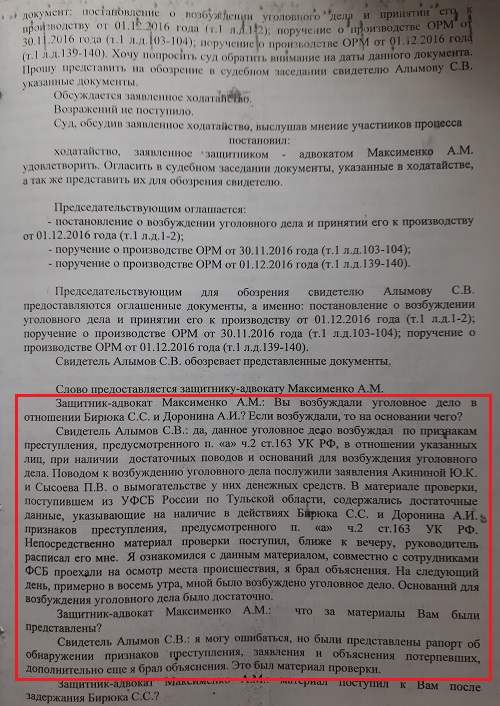 Кстати, как видно из ранее опубликованных материалов — Поручение №4769 от 30.11.2015 года, а объяснение Бирюка С.С. Алымов С.В. начал отбирать только в 01.30 01.12.2016 года.