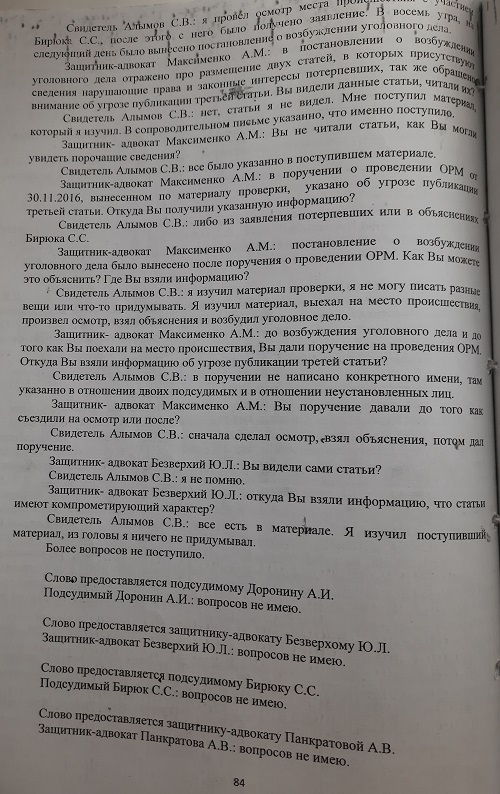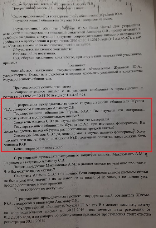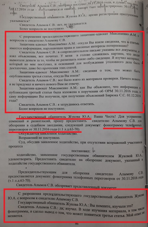 Как мы и обещали ранее, публикуем судебный протокол допроса старшего следователя Сергея Алымова.