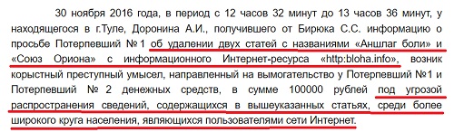Следователь Алымов при возбуждении УД усмотрел то, чего в ПТП не было и что затем следователь Юрищев исключил из обвинения. 🙂 Затем Юрищев заменил отсутствующую в ПТП угрозу распространения 3 статьи, на отсутствующую в диспозиции ст.163 УК РФ, а так же в показаниях Бирюка и потерпевших, угрозу ПРОДОЛЖЕНИЯ распространения. Вот и вся «совокупность доказательств»..