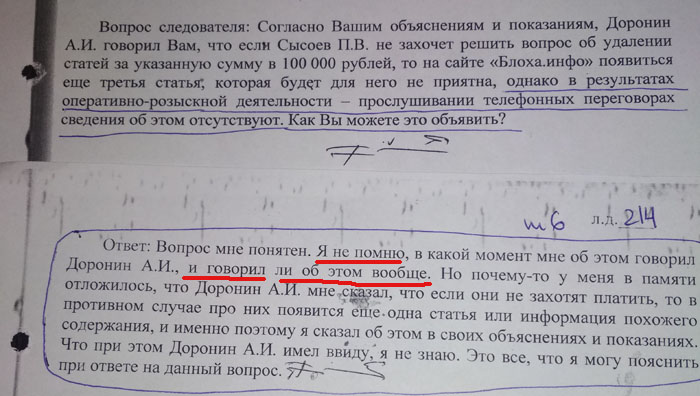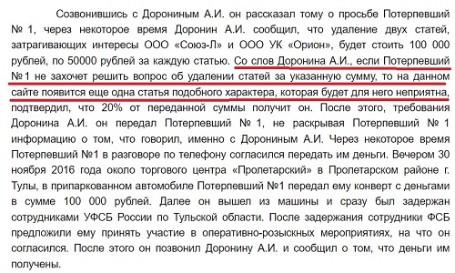 Который на всех допросах, утверждал только о высказывании Дорониным угрозы «распространения третьей статьи», что кстати подтверждается приговором суда …