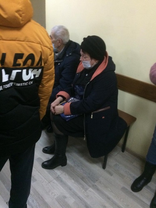 В очереди на вакцинирование очень много пожилых людей, а стульев на всех не хватает. Люди на них сидят по очереди!