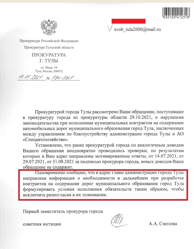 Итак, текст ответа прокуратуры города Тулы, пришедшего в «Прессу свободную».
