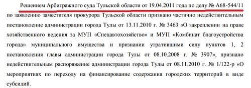 Вот, к примеру, решение от 19 апреля 2011 года по арбитражному делу № А68-544/11, когда целый заместитель областного прокурора выступает в защиту ООО «Сервис центр», которое городские депутаты, чиновники городской администрации, а также МУП «Спецавтохозяйство» и МУП «Комбинат благоустройства города» не допускали принять участие в разделе городских субвенций на дорожное хозяйство.