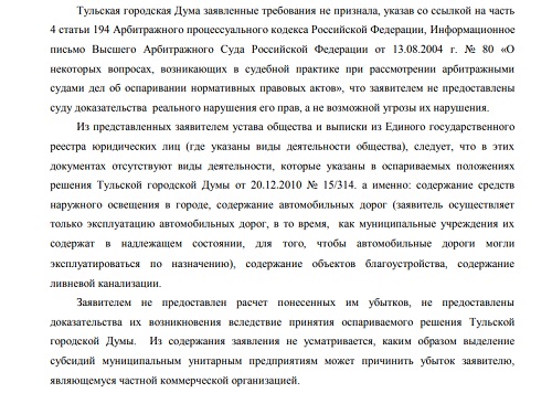 Предлагаем ознакомиться вот с этим абзацем из решения по делу А68-8052/11 по заявлению ООО «Сервис Плюс» (ОГРН 1077104000082, ИНН 7104055631) к Тульской городской Думе (ОГРН 1027100978960, ИНН 7107038105)