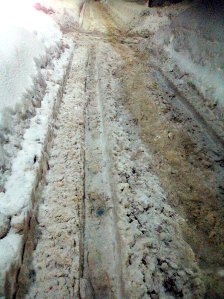 Но механизм очистки тротуара этот демон не опускает в рабочее положение, даже намёка нет на то, что он тут прошел с отвалом и щеткой, только следы колёсной тележки где установлена щётка. А отвал он вообще не опускал! Т.е. тупо проехал, нарисовал себе километраж, получил денежку.