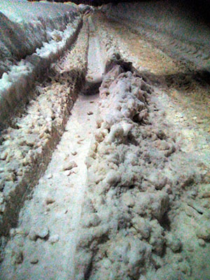 Но механизм очистки тротуара этот демон не опускает в рабочее положение, даже намёка нет на то, что он тут прошел с отвалом и щеткой, только следы колёсной тележки где установлена щётка. А отвал он вообще не опускал! Т.е. тупо проехал, нарисовал себе километраж, получил денежку.