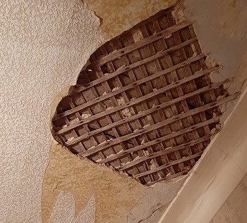Новые трещины и сколы в штукатурном покрытии потолка. Прогресс разрушений на лицо, и не надо быть экспертом в строительстве чтобы это не увидить. Другое дело наши «эксперты», которые купили себе диплом или вообще не имеет специального образования, и за деньги (большие деньги) берутся рассуждать о разрушениях и делать бредовые выводы о проливе которой был 5лет назад. А если рухнет перекрытие, причина это последствия землетрясения в Латинской Америке .