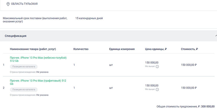 АО «НПО «СПЛАВ» имени А.Н. Ганичева» входящий в структуру Ростеха закупает два iPhone 13 (512 Gb) по 150 000 рублей каждый. Цвета – графитовый и небесно-голубой.