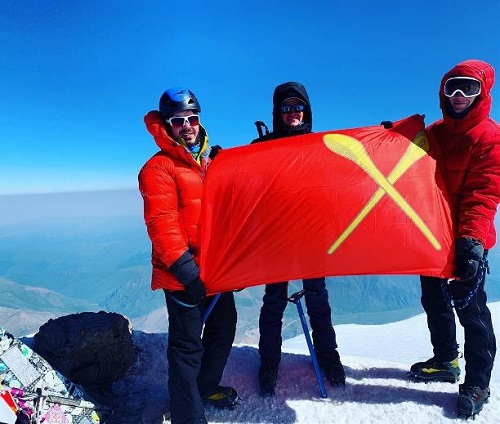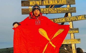 — 5895 метров над уровнем моря. Флаг моего города. И я, — пишет Вадим на своей странице.